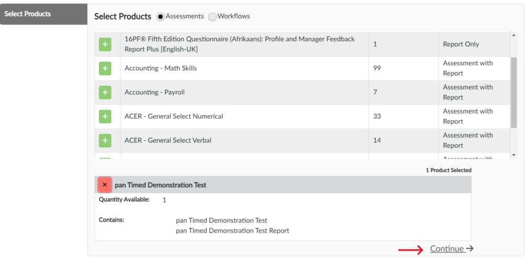 Click the plus sign (“+”) next to the assessment(s) or workflow(s) you are assigning, then click “Continue.” (Screen 2)