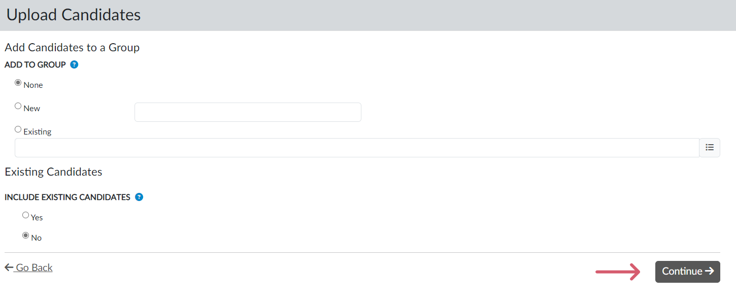 If desired, add candidates to a group, then click “Continue.” (Screen 7)