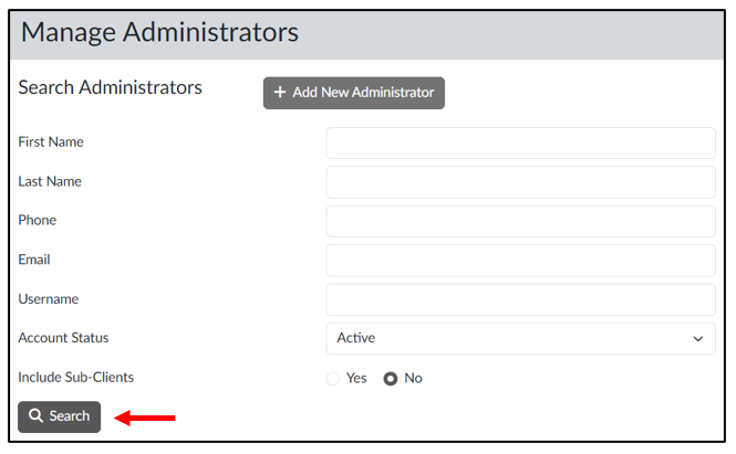 - Enter the First Name and Last Name or Email Address under “Manage Administrators” and click “Search.” (Screen 2)